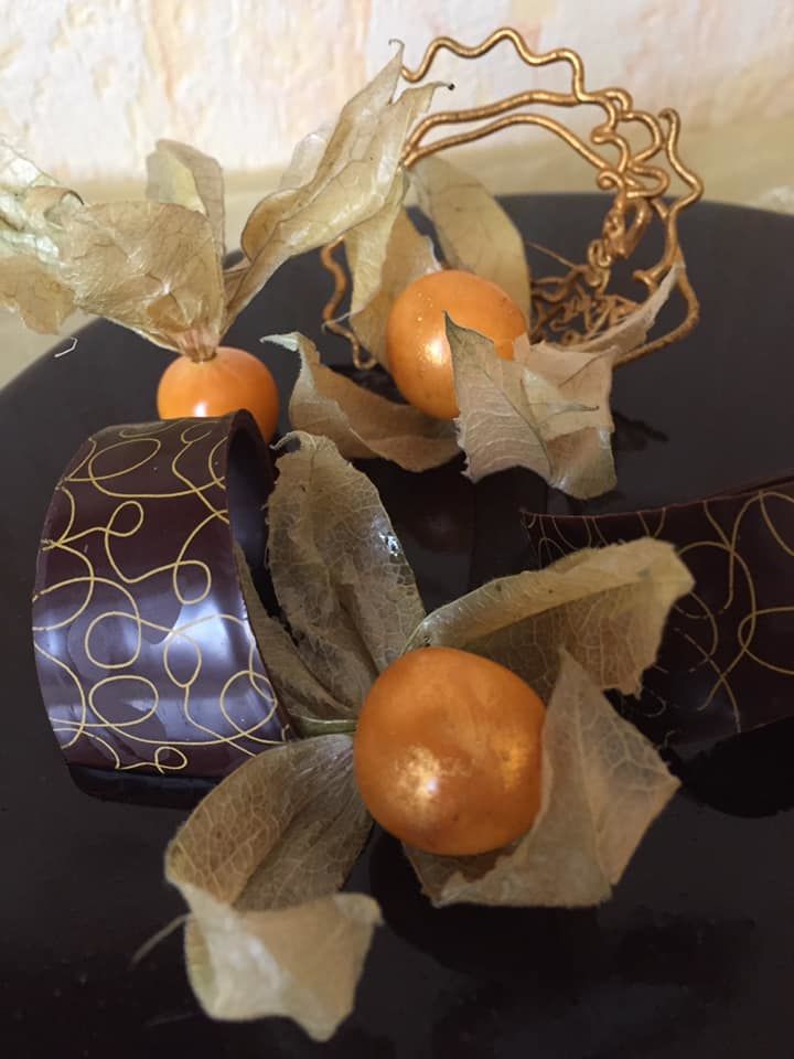 Entremet composé de 3 mousses, chocolat noir, lait et blanc, sur une génoise noisette avec croustillant feuillantine.